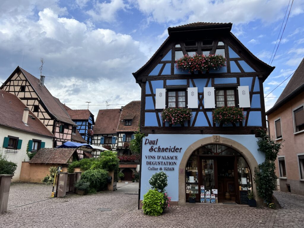 Eine Radtour durch die Weinberge in der Umgebung Colmar’s führte uns nach Eguisheim, südlich von Colmar gelegen. Zu unserer Überraschung war der Ort voller Touristen. Wie wir feststellten, bildet das Dorf Eguisheim (schönstes Dorf Frankreichs 2003) das Zentrum des Weinanbaugebietes rund um Colmar. Dieses mittelalterliche Dorf gefällt durch seine einzigartige Architektur, seinen Blumenreichtum; typisch elsässisch mit den alten Gebäuden und ihren Spitzdächern, bunten Farben sowie Fachwerkfassaden. Ein Muss auf jeder Reise ins Elsass.